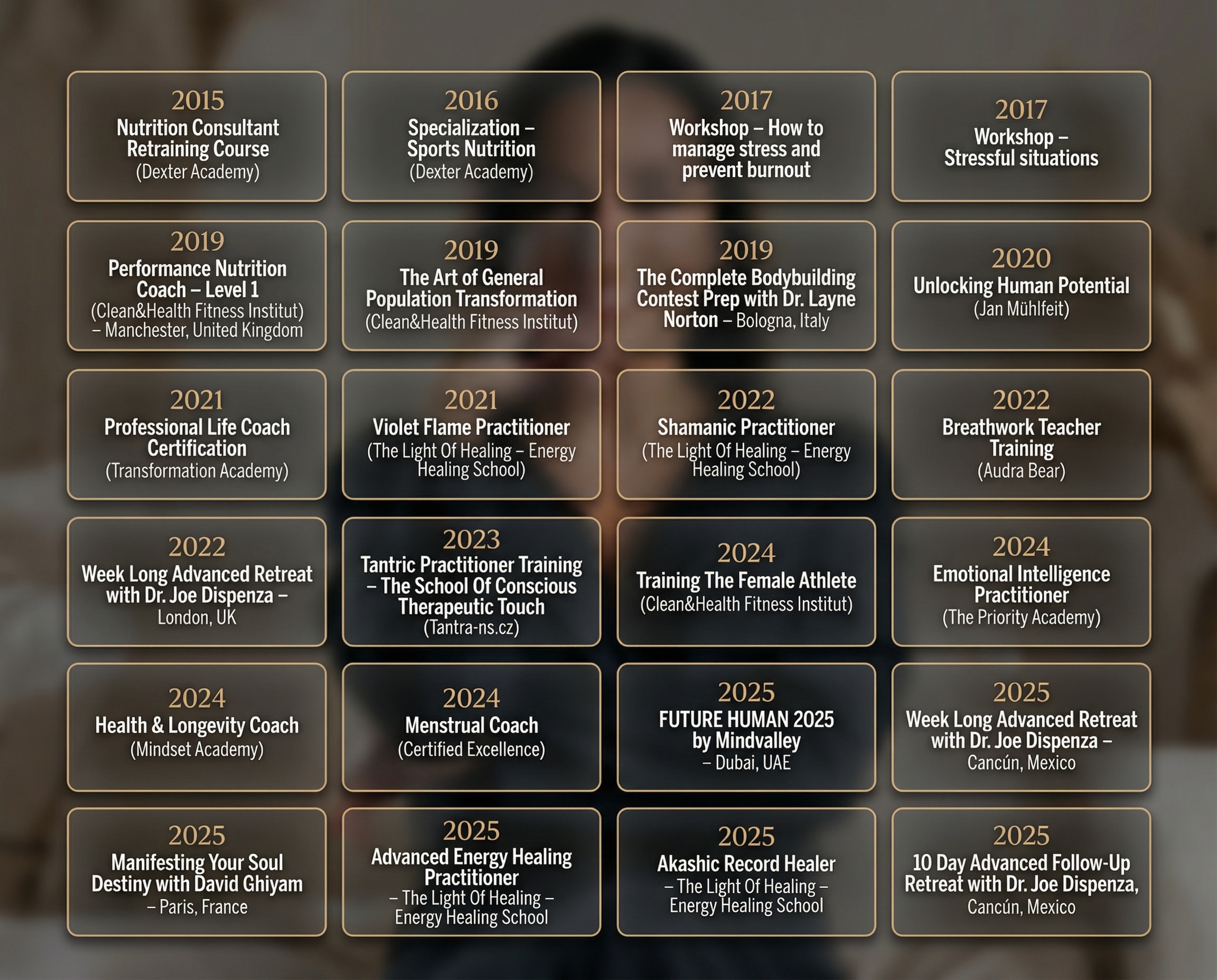 Tato zvědavost mě dovedla ke stovkám hodin terapií, desítkám transformačních výcviků a pokročilému studiu u světových špiček v oboru.